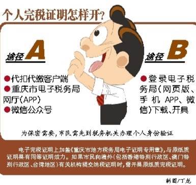 市地税局相关负责人称:开具电子完税证明有两种途径(见左图)。新的电子完税证明采用加密保存技术,每张证明由系统派发二维码和验证码,可以通过三个途径查验辨真伪:一是登录重庆市地方税务局官方网站并通过纳税服务-综合查询-完税证明验证菜单,录入验证码验证真伪;二是通过微信-扫一扫或重庆地税微信公众号-公众查询-扫描完税证明二维码菜单,扫描电子完税证明上二维码验证真伪;三是从市地方税务局官网下载验证工具,对网上下载导出的PDF格式电子完税证明进行验证,看其CA签名是否真实唯一。